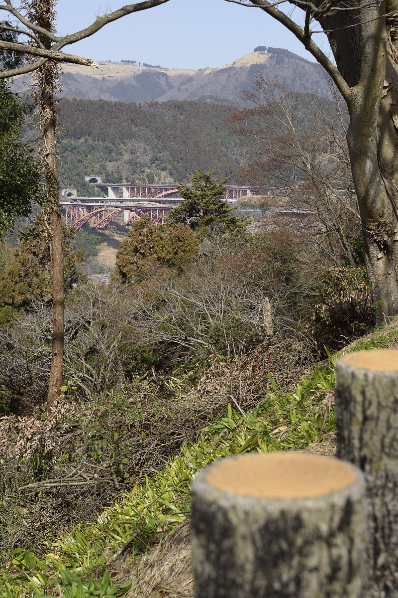 赤い鉄橋は東名高速。この道の向こうに繋がるのは静岡県、つまり駿河国。