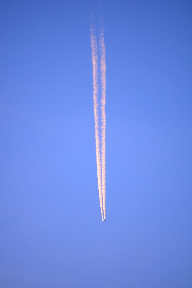夕陽に染まり、オレンジ色の飛行機雲が延びていきました…